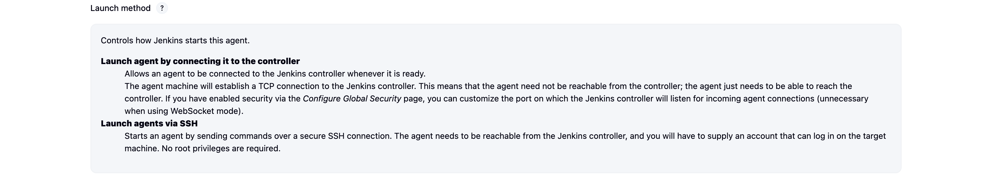 Launch agent via SSH : 말 그대로 Controller가 SSH를 활용하여 Controller에게 접속하는 방식이다.