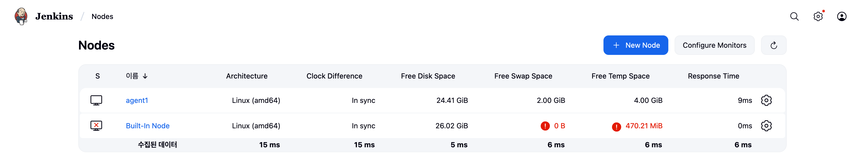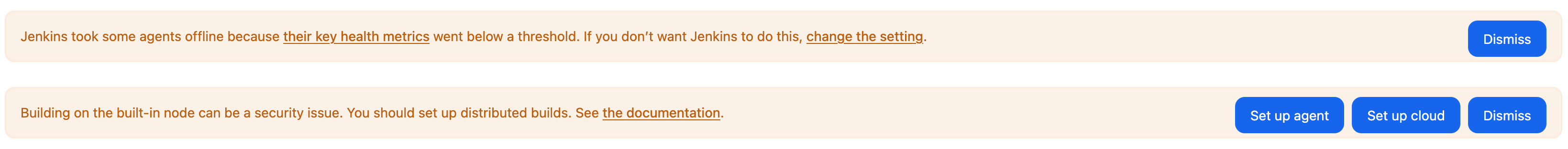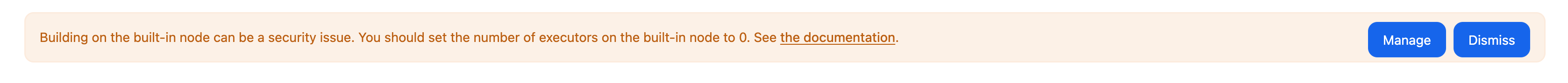 두번째 경고는 built-in-node(controller 서버에서 실행하는 노드)를 수행하면 보안상 위험이 있다는 경고이다.