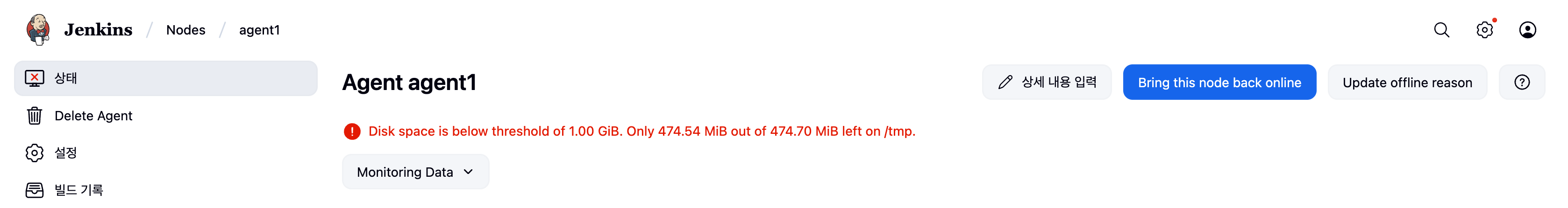 하지만 agent1의 /tmp 의 용량이 threshold로 정한 1GiB보다 작다고 경고를 보내고 있다.
