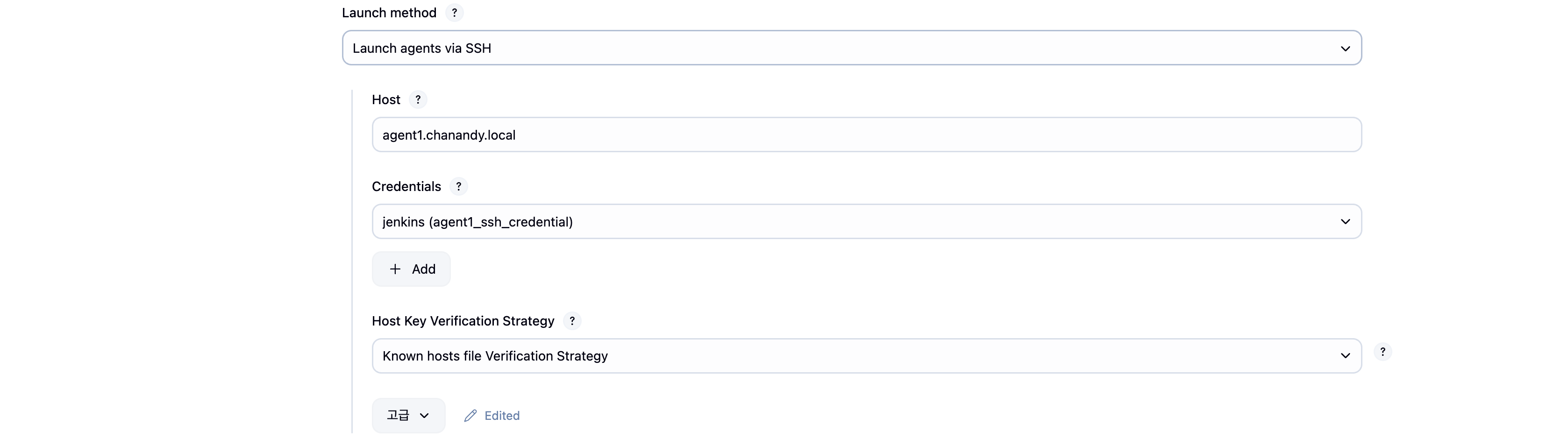 위에서 만든 SSH credietial을 선택한다. Host는 Agent에 접근할 때 필요로 하는 IP주소 또는 Hostname을 설정한다.